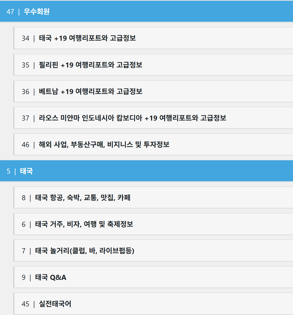 우수회원 및 각 나라별 게시판은 일반적으로 위 사진과 같이 구성되어 있으며 나라별 특색에 맞게 추가 게시판들이 있습니다. 회원등급별 접근 권한을 다시 이해하시기 쉽게 설명드립니다.