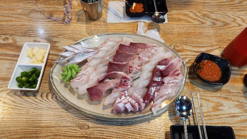 - 저녁 나원회포차 ( 서귀포시 소암로 30 (서귀동) 먹으러 왔더니 월요일 휴무라 근처 급하게 찾은곳이 서귀포 매일 올래시장 기흥어물..리뷰가 별로 없어 그냥저냥 적당한곳으로 생각했는데 사람들이 줄서서 포장해 가는것에 놀라고 회값 저렴한것에 만족 (모듬 광어 돔 방어 35000원), 식당에서 먹으려면 근처 상차림 식당에서 인당 5000원에 가능.