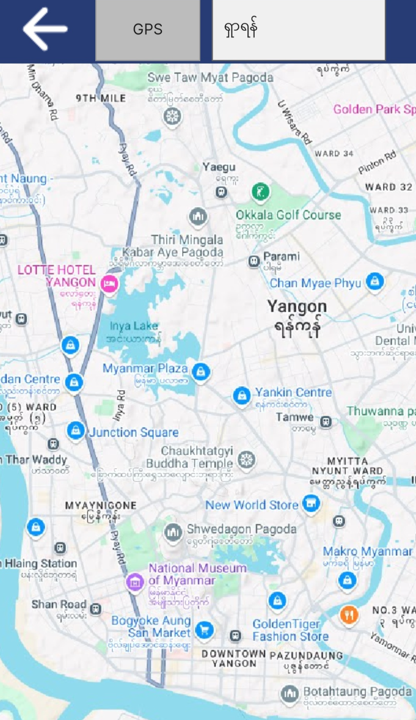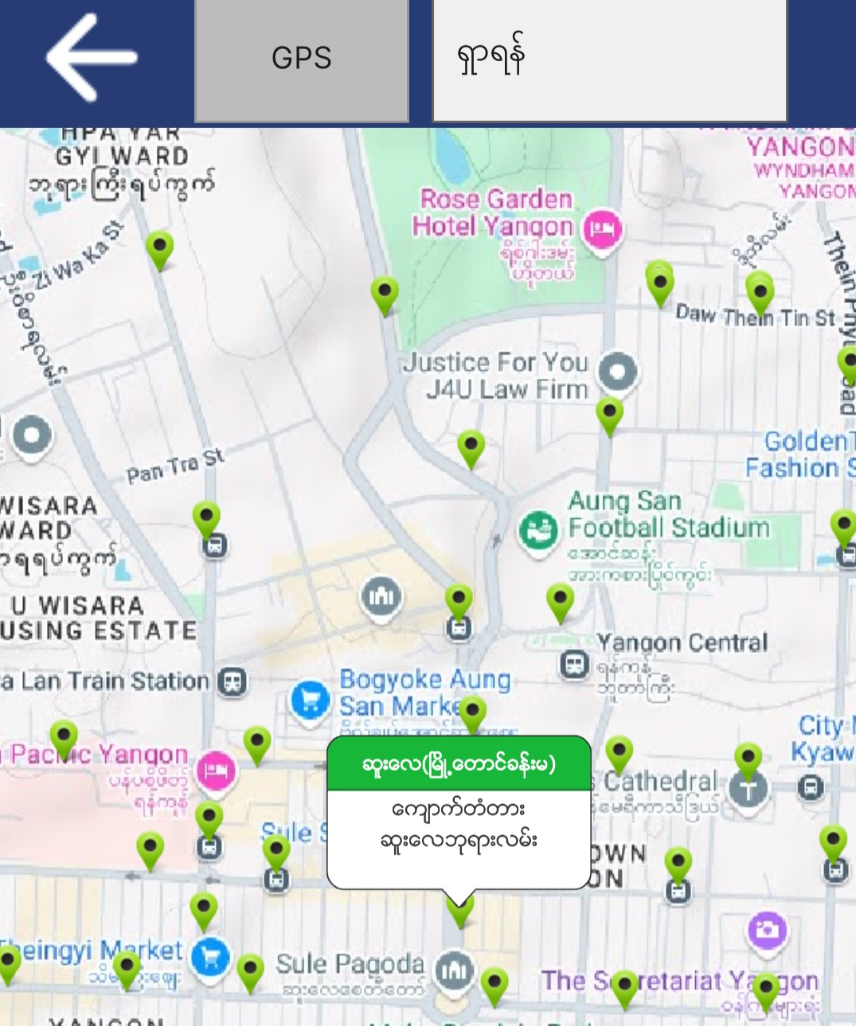 가야 할 녹색 점을 클릭하면 미얀마어로 된 대화 상자가 표시되고 상자를 클릭하기만 하면 됩니다(YBS 앱은 현재 위치를 빨간색 점으로 표시합니다)
