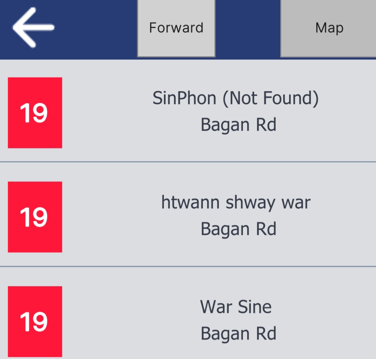 저는 버스 번호 "19"를 입력하고 입력하면 앱에 아래 그림과 같이 표시됩니다.