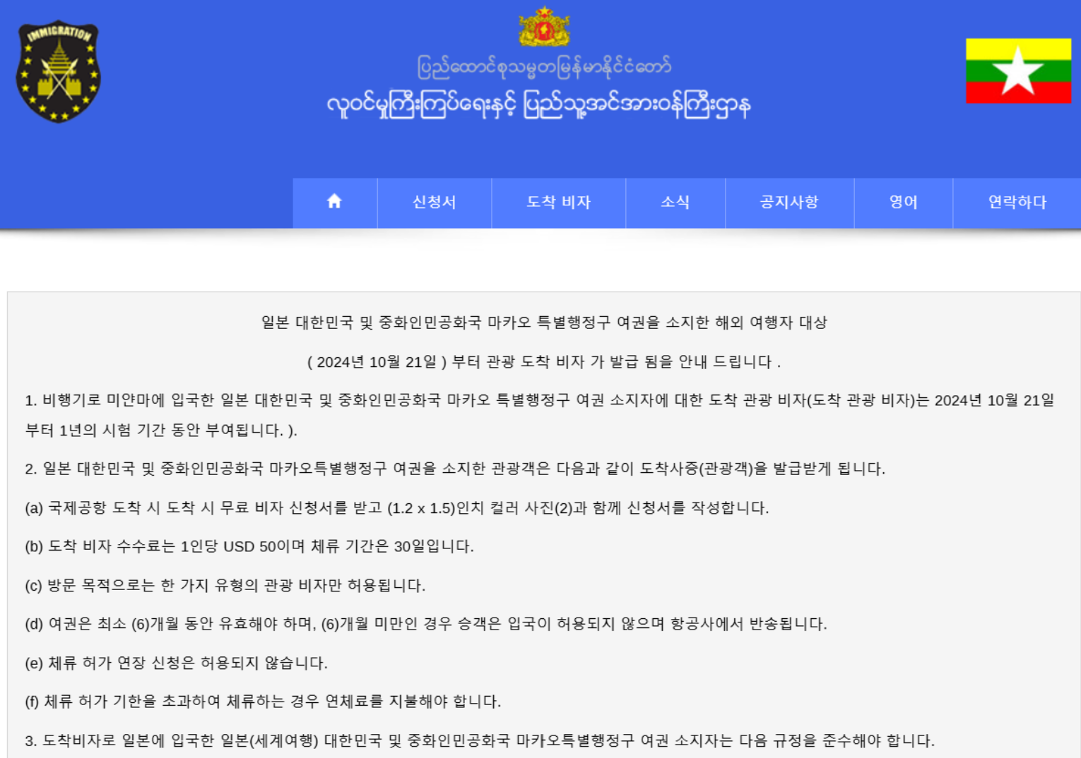 미얀마 정부에서 한국인 대상 도착 관광 비자 시행을 공표 했습니다.