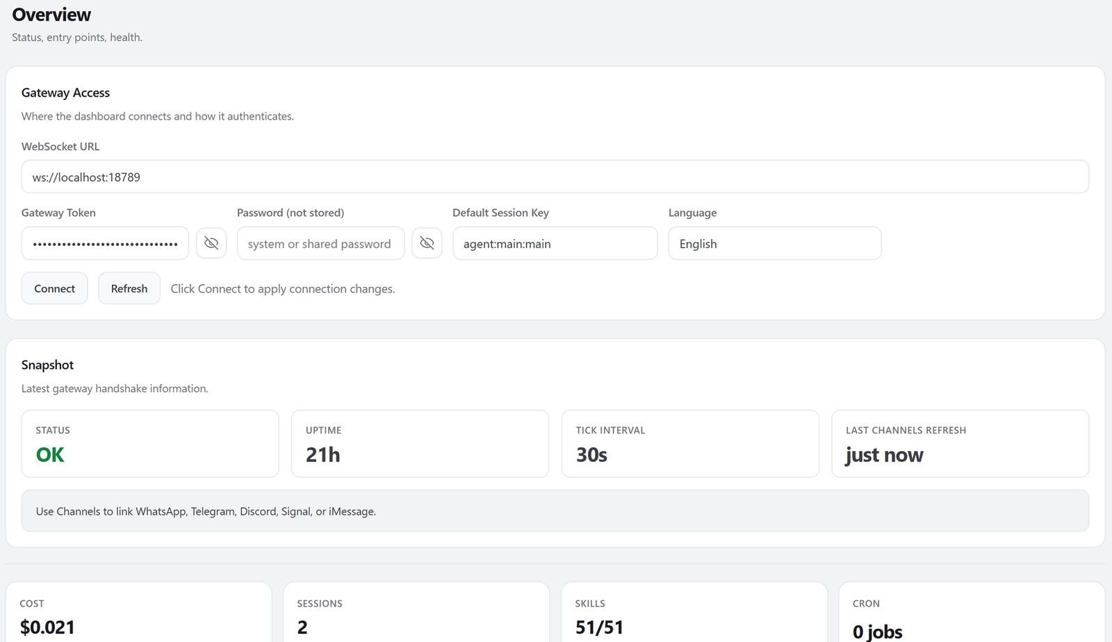 브라우저에 URL 붙여넣기 출력된 http://127.0.0.1:18789/?token=... URL을 브라우저에 붙여넣습니다. |