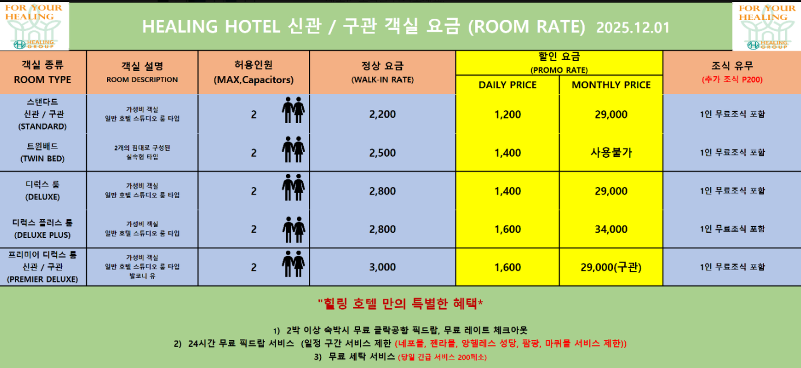 여행포럼블로그로그인회원가입로그아웃내 포인트 정보Home 포럼 필리핀 필리핀 항공, 숙박, 교통, 맛집,... 앙헬레스 힐링호텔 과 힐링콘도 알림 모두 지우기 앙헬레스 힐링호텔 과 힐링콘도 RSS anglin2 (@anglin2) 회원 가입일: 4개월 전 글: 21 주제 스타터 27/04/2026 2:21 오전 제가 앙헬레스 갈때 자주 숙박하는곳인 힐링 콘도와 힐링 호텔(구 캘리포니아 호텔 및 캘리포니아 콘도) 입니다. 최근 보니 한달살기용 달방 가격이 많이 올랐긴 한데 그래도 픽드랍 무제한에 차량 많아 대기시간 짧고 스튜디오 룸은 1박 1200페소 약 3만원에 조식포함이면 준수한 가격이죠. 워낙 유명한 곳이니 앙헬레스 다녀오신 분들은 다 아실만한 콘도 및 호텔이지만 모르시는 분들을 위해. 인용 주제 태그 앙헬레스 호텔추천 앙헬레스 힐링호텔 앙헬레스 한인호텔