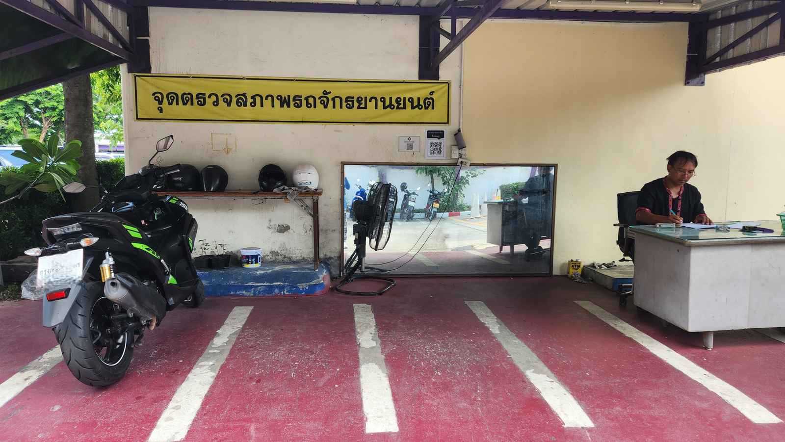 - 오토바이 검사는 해당 건물 나가서 뒷쪽편에 아래 사진과 같이 있습니다. 이곳에 가서 롱타삐얀 (등록) 또는 레지스터 라고 얘기하면 알아듣고 필요한 검사들 (시리얼넘버와 모델명 확인, 튜닝여부, 브레이크, 가속, 라이트 등의 기능 검사를 마치고 서류에 이것저것 적고 도장을 찍어 줍니다.)