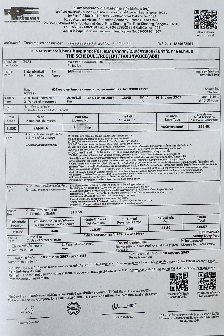 - 만약 세금과 보험을 납부하라고 하면 1층 우측편에 세금과 보험판매하는곳이 있으니 바로 이곳에 가서 세금을 내고 보험을 구매하면 됩니다. 세금은 1년에 약 200바트 전후, 보험비용은 약 750바트 정도 합니다. 보험서류는 2장을 출력해서 주는데 1장은 본인 소유 다른 한장은 등록시 제출용 입니다.
