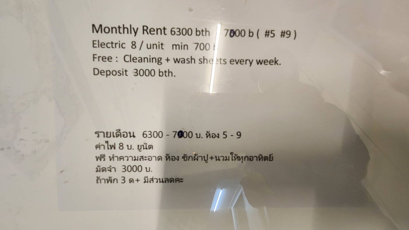 위 라인 QR로 라인 추가해 직접 연락해 예약하면 1박당 500바트. 한달거주는 6000바트에 전기 미터당 8바트, 물은 한달 300바트 고정비. 단, 하나의 단점은 수건을 제공안해줘서 본인이 직접 가져가거나 주변 가게에서 구매해야 하는데 구매하면 100바트. 아주 좋은점은 1주일에 한번 청소가 무료입니다.