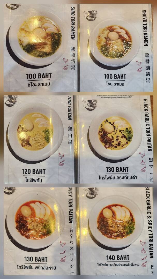 가성비 일본라멘집으로 돈카츠 돼지뼈 베이스 육수가 아닌 닭뼈 베이스 육수로 챠수도 닭가슴살 챠수로 닭가슴살도 부드럽게 잘 조리한 일본라멘이 100바트 부터 시작.