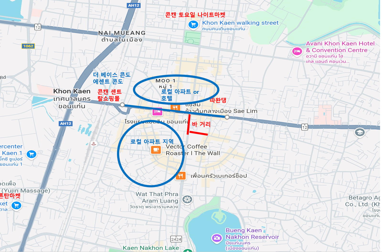 위쪽 파란색 납작원에 숙박시 콘캔 따완댕또는 납작원 아래 파란색 도로쪽에 있는 여러 바와 클럽들에 쉽게 접근이 가능하고 (도보 약 5분정도) 그 밑 빨간색 라인들의 바와 클럽 거리까지도 도보 10분이 안걸리니 놀러다니기엔 최적의 위치이나 야시장을 가기에는 약간 거리가 있어 아래 파란색 원형지역을 제일 추천합니다.