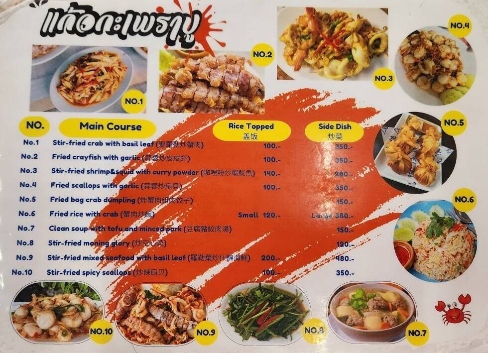 메뉴판 보면 수많은 메뉴가 있지만 제 최애 메뉴는 갯가재를 포함한 각종 해산물이 모두 들어간 9번 Stir Fried Mixed Seafoods Basil Leaf (볶음 모듬해물)메뉴로 덮밥은 200밧, 요리로 시킬시는 밥 없이 모듬해산물만 나오는게 480밧 입니다.