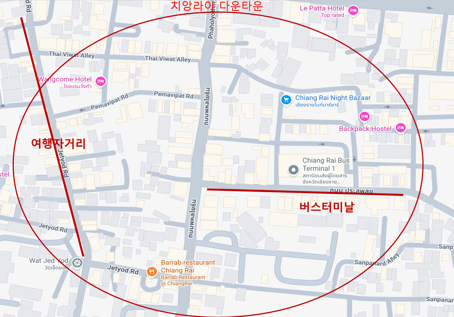 - 여행자 거리는 버스터미날에서 도보 약 5분 정도거리로 오토바이 렌트샵들은 이 거리에 대개 모여 있고 호텔이나 유스호스텔도 이 거리에 꽤 포진해 있다. 그리고, 술집(펍) 들도 이 거리에 있어 숙소를 정할때 여행자 거리 쪽에 숙박하는걸 추천하고 조금 떨어지더라도 버스터미날 근처에는 숙박하는게 좋습니다.